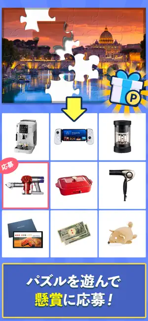 - ジグソーパズルを解きながら懸賞に応募できる、遊び+懸賞が両立したアプリ!