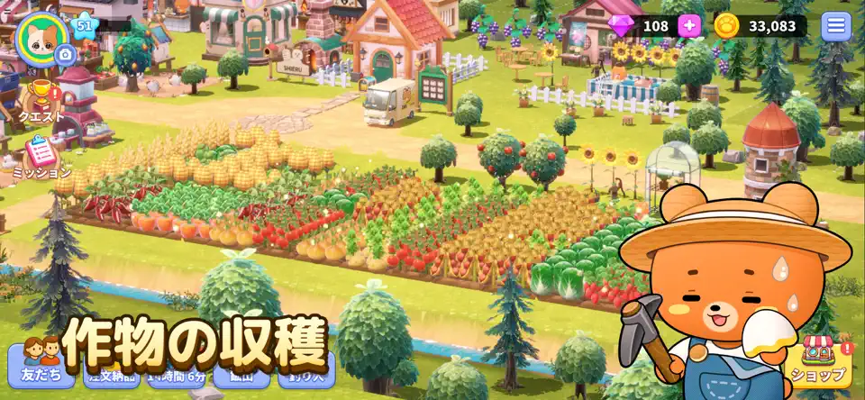 キャラがかわいい、癒される農園ゲームです。ランク57まできましたが特に不便は感じず、楽しくやれています。無課金で十分ですが、お店をどんどん建てたい方や、倉庫が狭いとストレスを感じる方は、微課金をするとよさそうです。